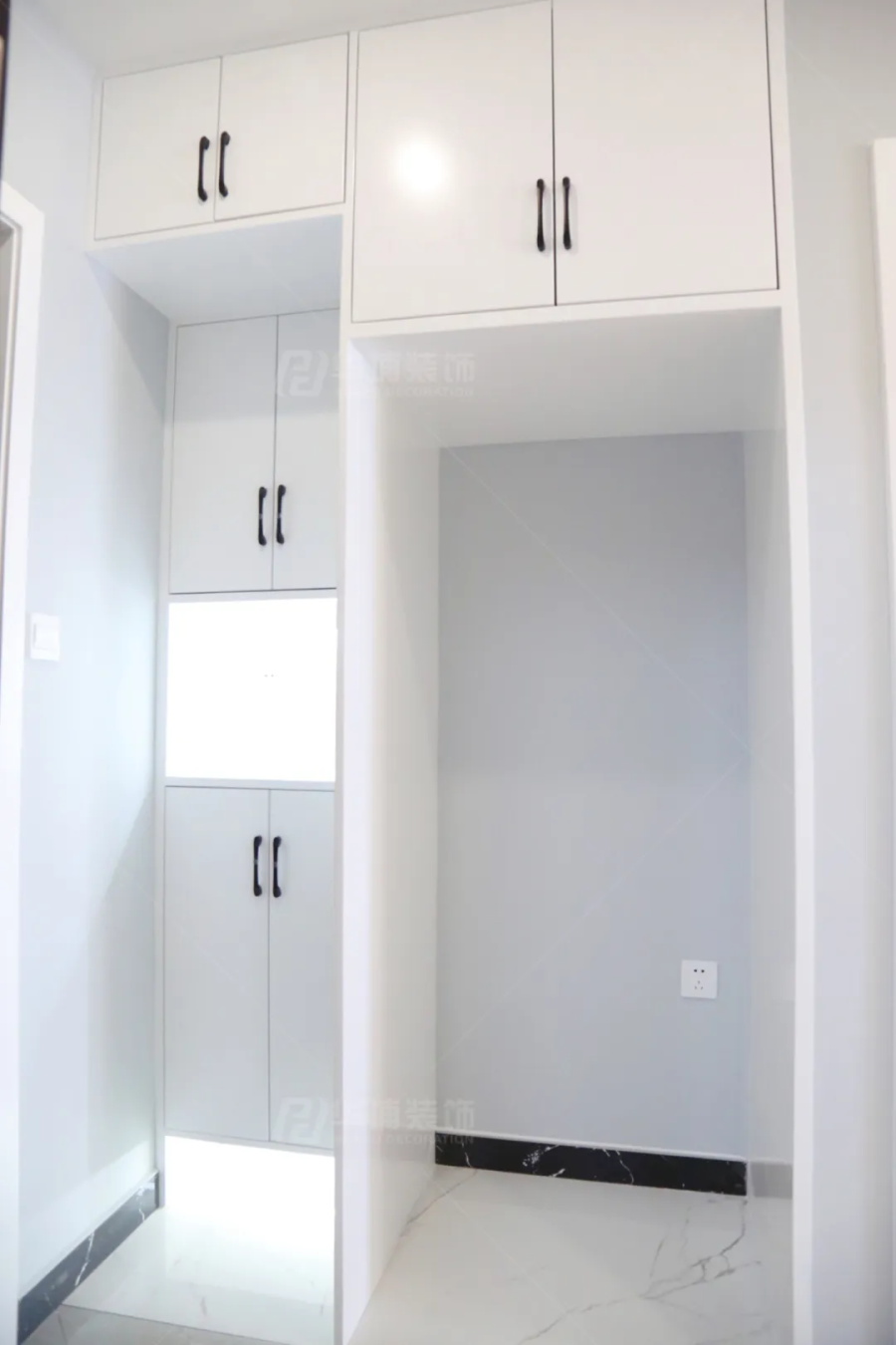 一入戶,整體給人的感覺就很干凈。因為整個戶型設(shè)計的左側(cè)全部是臥室空間,就顯得玄關(guān)走廊很長,拉伸了整個視覺。玄關(guān)柜是借用臥室門洞空間做的內(nèi)嵌,同時預(yù)留出冰箱的位置,做到每一寸空間的合理使用。