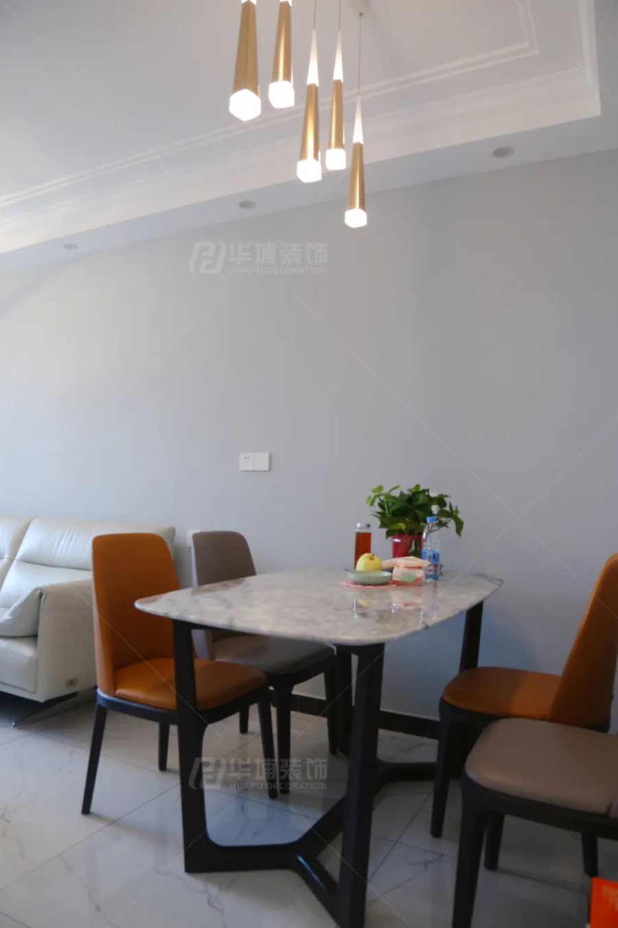 天然石材餐桌,皮質(zhì)餐椅,金屬水晶燈,簡簡單單的搭配,卻將整體的質(zhì)感凸顯。