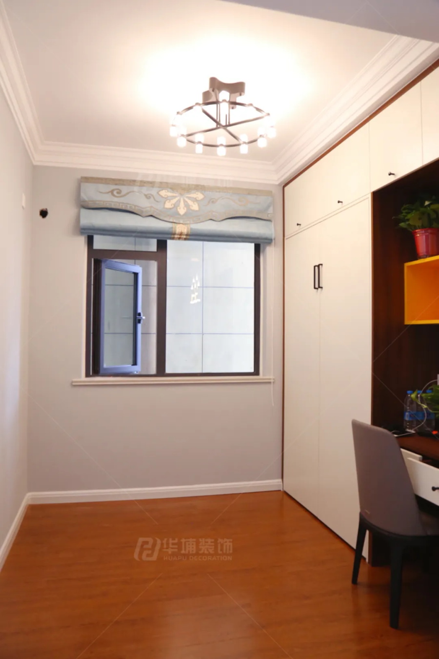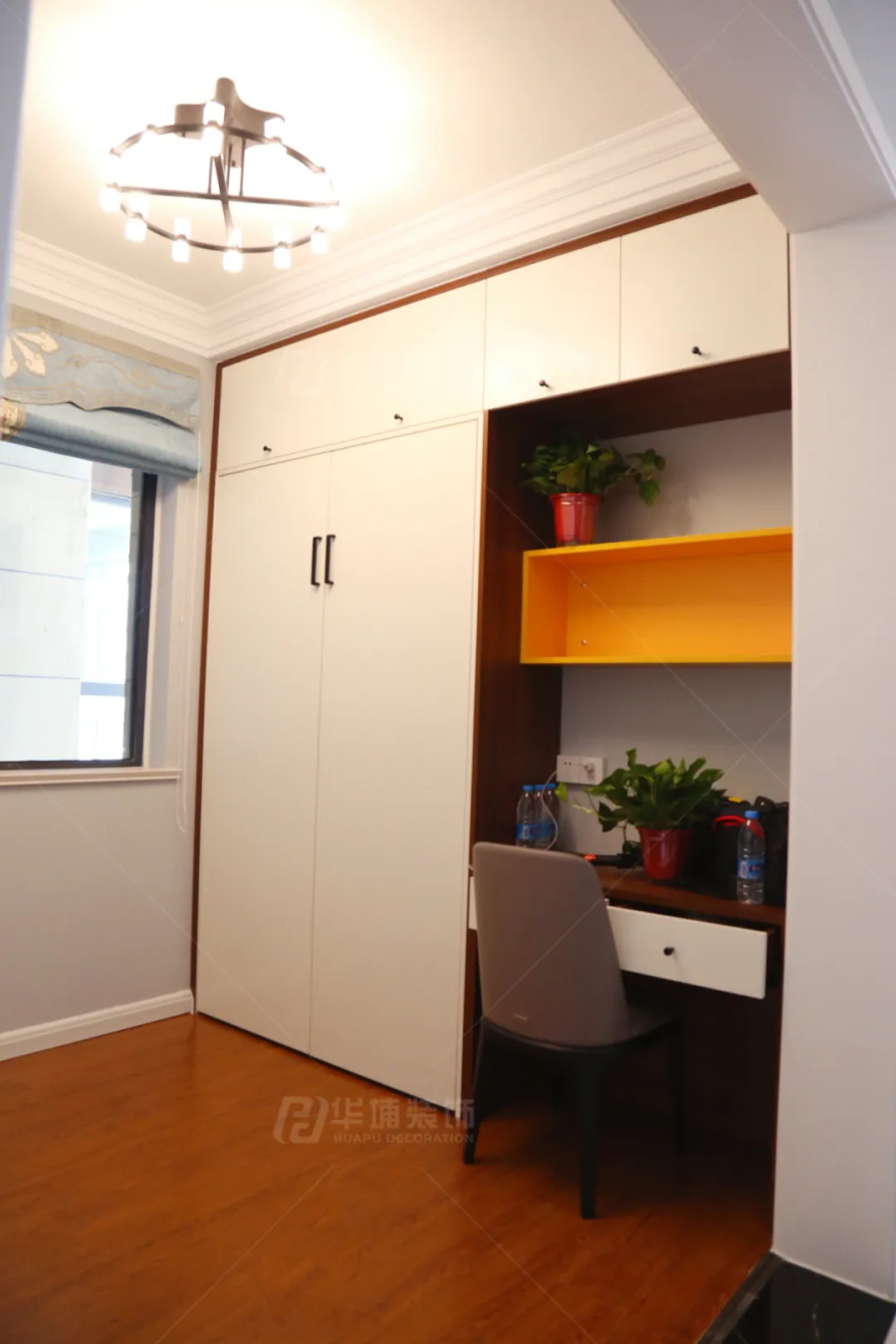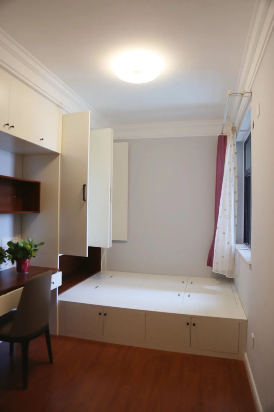 是不是感覺書房活動區(qū)域很充足呢?那是因為床做的隱形設(shè)計,直接藏在衣柜里邊,后期給房間裝上推拉門,完全不影響私密性和采光,是一個很好的待客空間。
