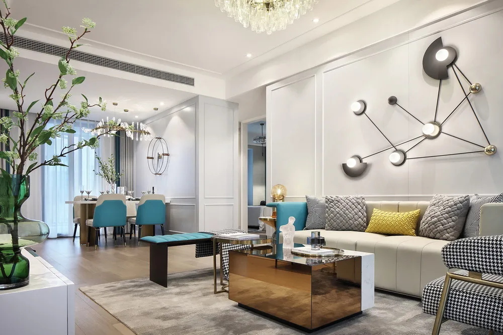 客餐廳以鏤空的金屬隔斷做功能分割,全開放設(shè)計(jì),多處落地窗,組合沙發(fā),保持了整個(gè)空間的通透性。客廳以莫蘭迪藍(lán)+金屬線條裝飾,低調(diào)的精致。