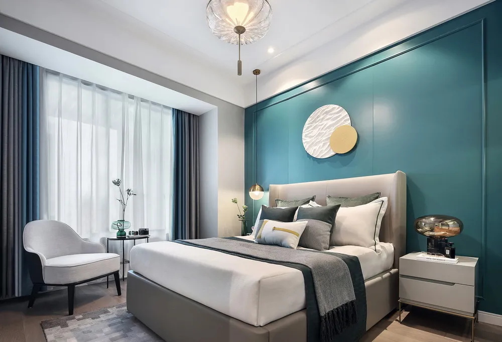 顧佳的臥室是一個(gè)大套間,集衣帽間、衛(wèi)生間、臥室于一體。衛(wèi)生間的浴缸就設(shè)置在床邊,泡澡的時(shí)候可以欣賞窗外的風(fēng)景,落地窗選擇百葉窗簾,既實(shí)現(xiàn)采光,又能保證隱私。