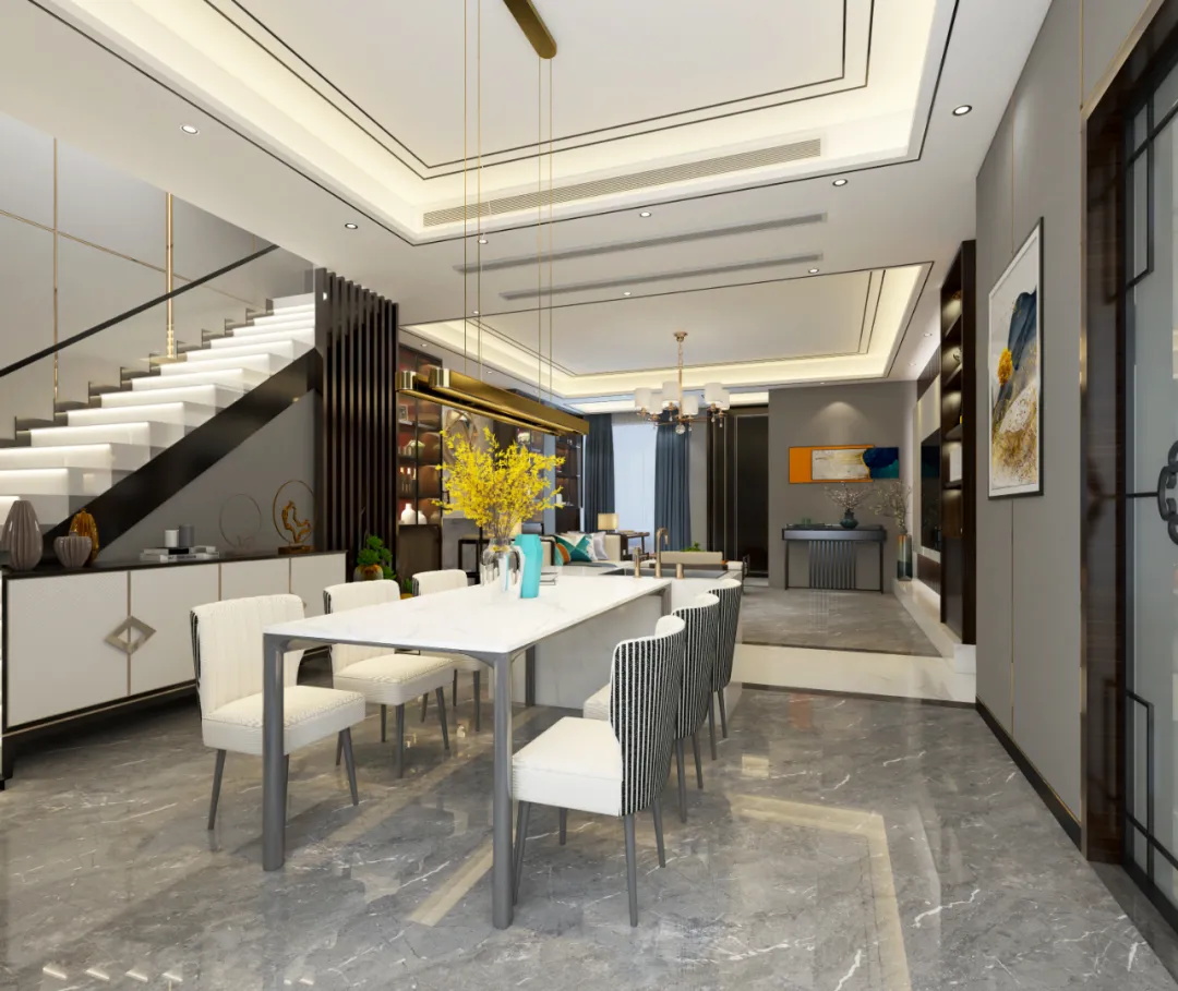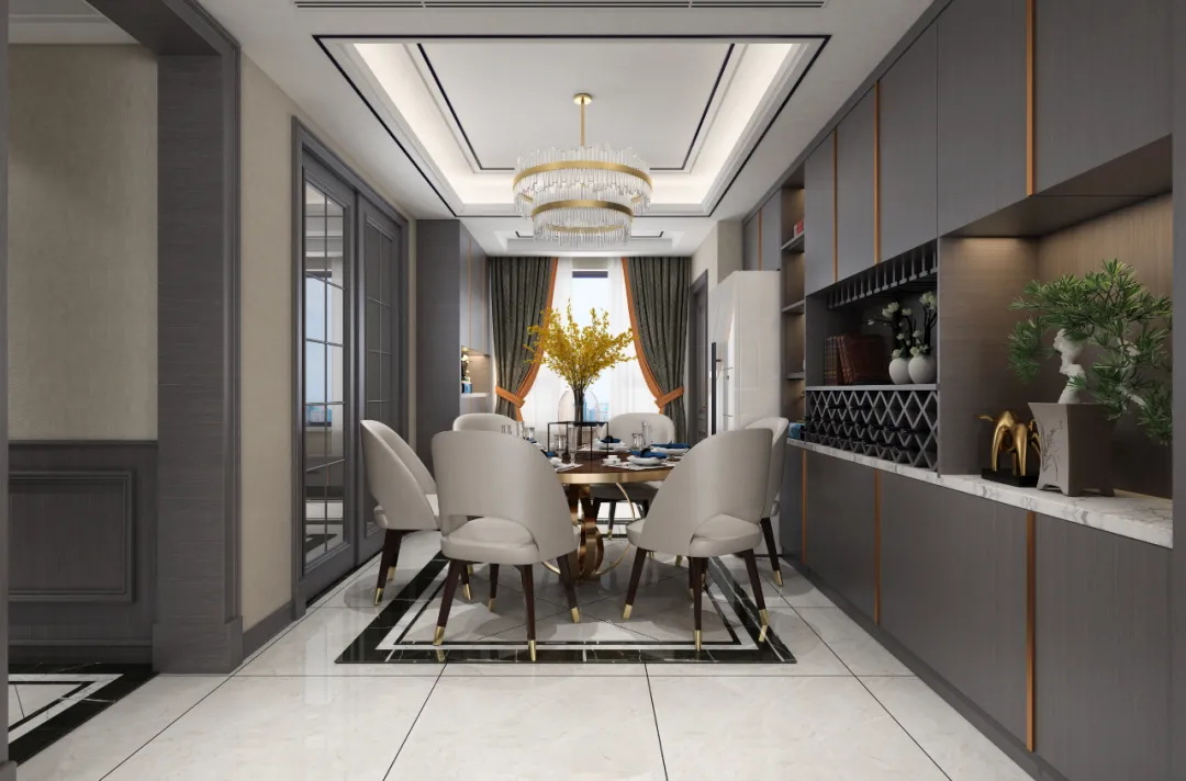島臺(tái)另一側(cè)就是餐廳,擺放了一張大的夸張的餐桌,一半用餐,一半做下沉的淺水槽擺放水花狀的風(fēng)水局。因?yàn)轭櫦咽亲鰺熁ㄉ獾模瑔踢w不能跨火盆,擺個(gè)風(fēng)水局寓意風(fēng)生水起、細(xì)水長(zhǎng)流。餐廳的天花上掛了一個(gè)投影儀,為了方便許幻山看設(shè)計(jì)圖用。