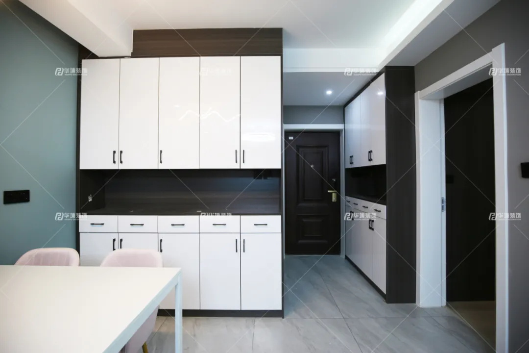 入戶是一組三段式玄關柜,用來存放衣服、鞋子、包包、鑰匙等,規整零散的生活。
