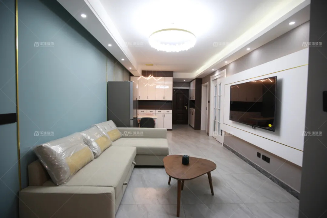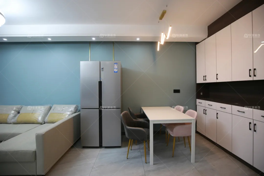 客餐廳開放設計,藍綠色的背景墻從餐廳一直延伸到客廳陽臺,放大了整個空間的視覺效果。電視墻則夾在廚房與衛生間中間,通過白色的石膏板進行凸出,再以金屬線條勾勒,做一圈燈帶,來強化舒適的感官效果。