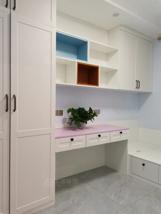 因?yàn)榕⑦€比較小,所以在色彩的運(yùn)用上選擇了比較甜美的粉色系,再通過白色、藍(lán)色的搭配點(diǎn)綴,將清爽、溫馨的氛圍營造。