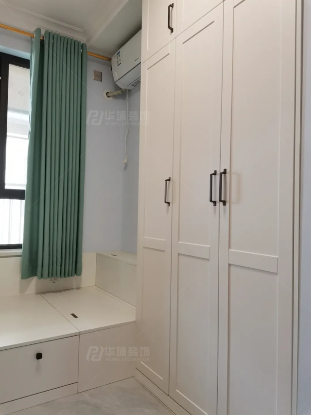 客臥比較小,榻榻米是最省空間也最實(shí)用的選擇。設(shè)計(jì)師在這里做了榻榻米連柜書桌的設(shè)計(jì),同時(shí)滿足休息+儲物+學(xué)習(xí)的多重需求,很便利。