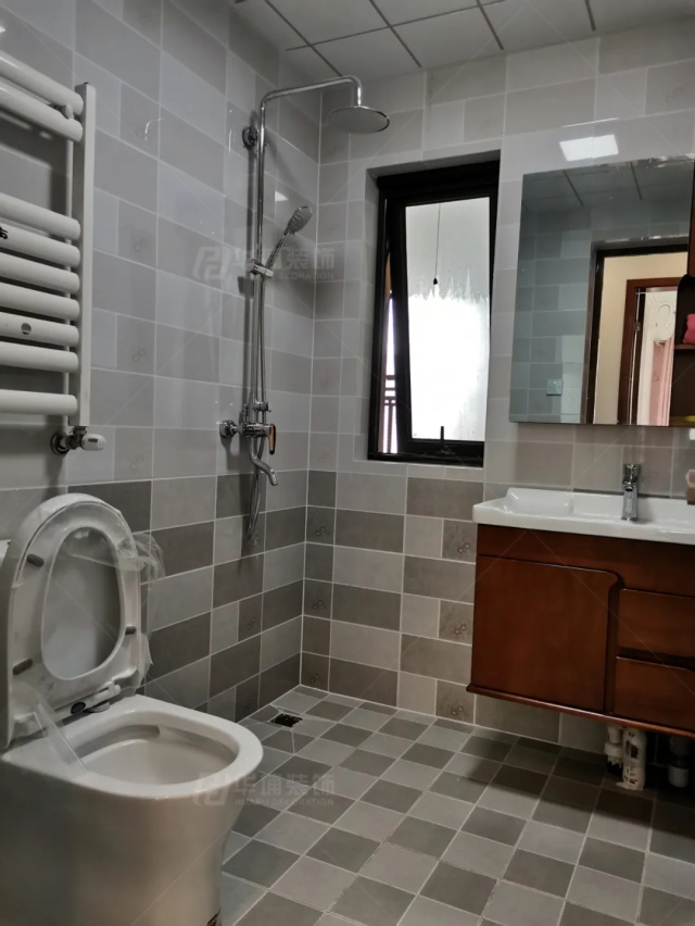 衛(wèi)生間墻面選用灰白拼接瓷磚,不同規(guī)格的剪裁拼鋪,讓不寬裕的空間看起來有層次感一些。馬桶、淋浴和洗手臺,做了三角形分區(qū),功能性很強(qiáng)。