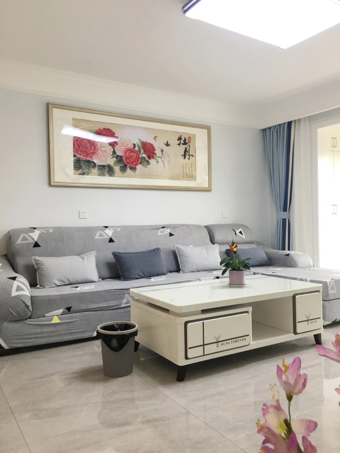 客廳第一感覺就是純凈,“出淤泥而不染”。灰藍(lán)色的乳膠漆背景,再用石膏線勾勒邊框,簡簡單單又不失落落大方。目光聚焦沙發(fā)墻上的十字繡《牡丹花開富貴》,是兒媳花了一年的時間一針一線刺繡成的,作為喬遷賀禮,滿載愛意。