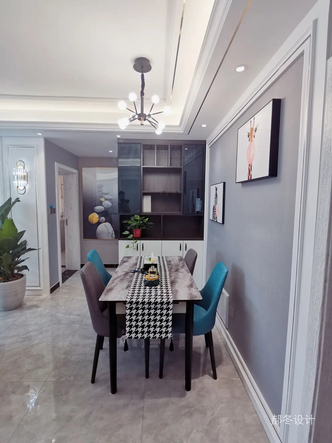 馬先生家常住人口為四人,所以空間陳設以四人標配,對儲物沒有過多的要求,主要是設計感與質感的呈現。餐廳是正對著入戶門的,也沒有玄關的陳設,并且原始戶型中餐廳的后方就是衛生間,居住體驗感不是很好。設計師就在餐廳后方建了一個墻體做酒柜,以玻璃的形式展現,既可以收納,又可以作為規避風水問題的隔斷,一舉多得。