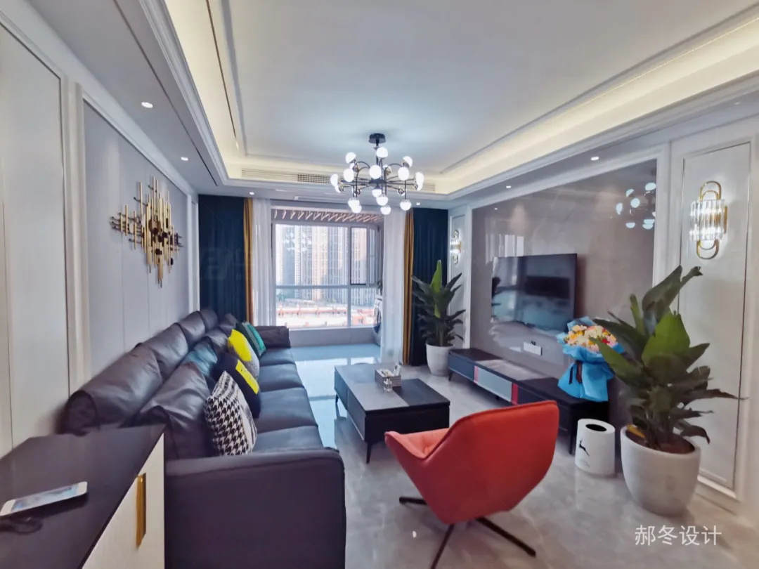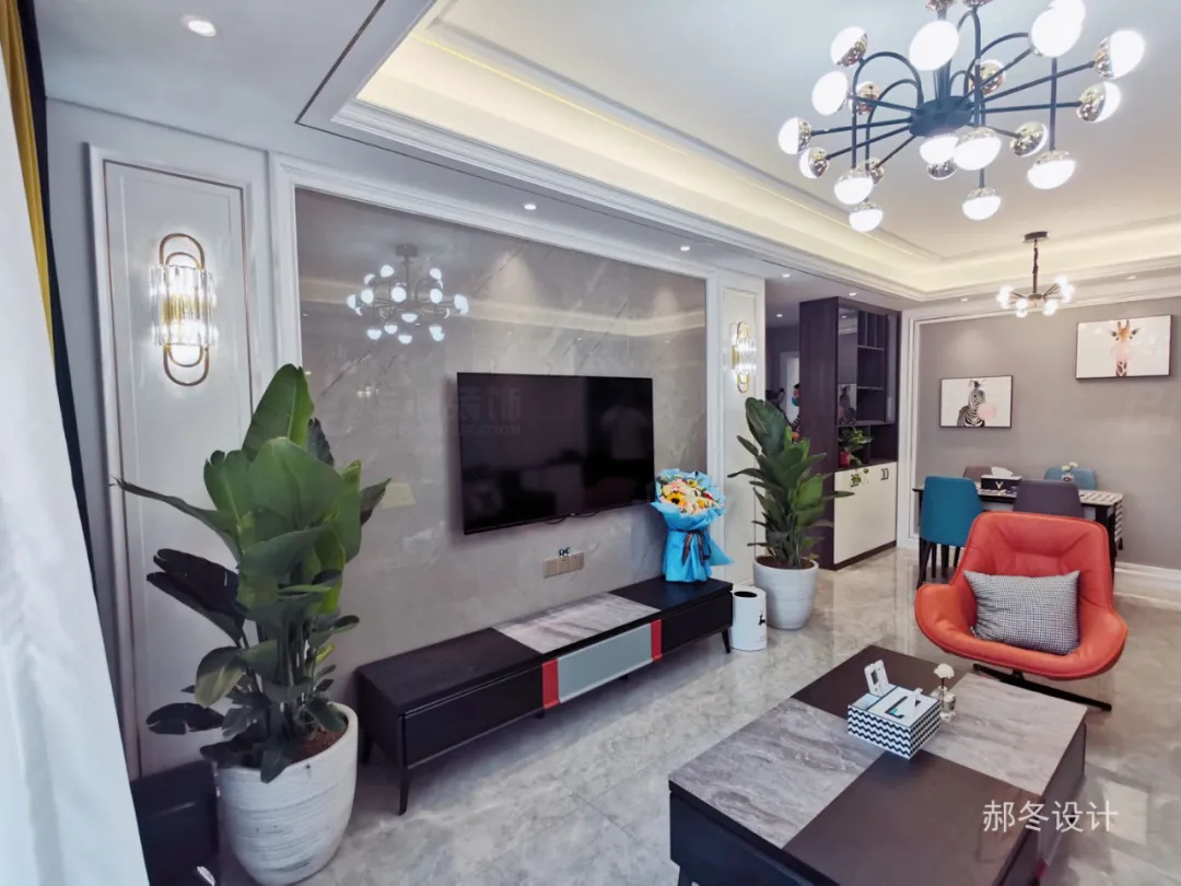 客廳整體是灰白質感,電視墻以大板磚+護墻板+不銹鋼條+金屬水晶壁燈做對稱造型,將清雅低奢的感覺襯托。沙發背景和電視墻相呼應,利用硬包+護墻板+不銹鋼條的形式構圖,中心再做不規則圖案,來展示整個會客空間的設計感。