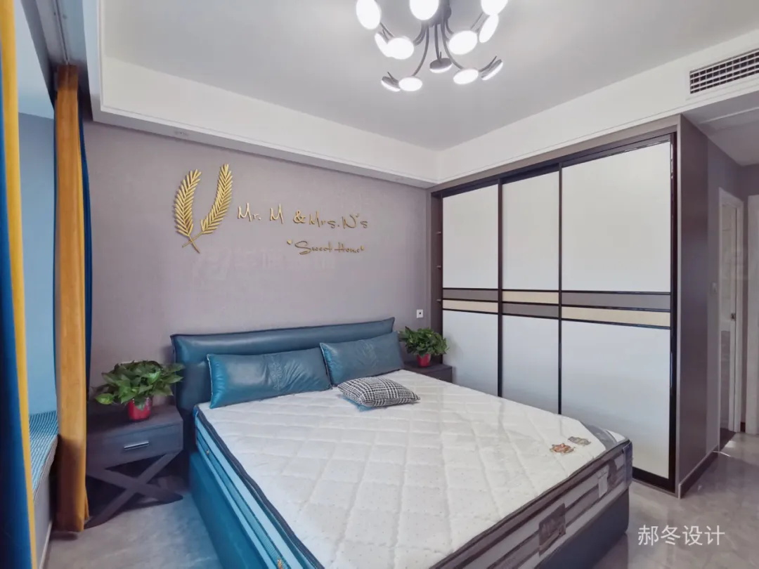 臥室是休息的場所,整體要舒適,空間感要足。由于是全房的中央空調,所以用頂角線做吊頂的層次感,不顯壓抑,不覺突兀。再看色彩的搭配,藍色、亮黃的點綴,讓靜謐的空間瞬間跳躍。床頭背景以金屬線條書寫的“馬先生和王女士的甜蜜小家”更是獨家定制,濃情蜜意,溢于言表。