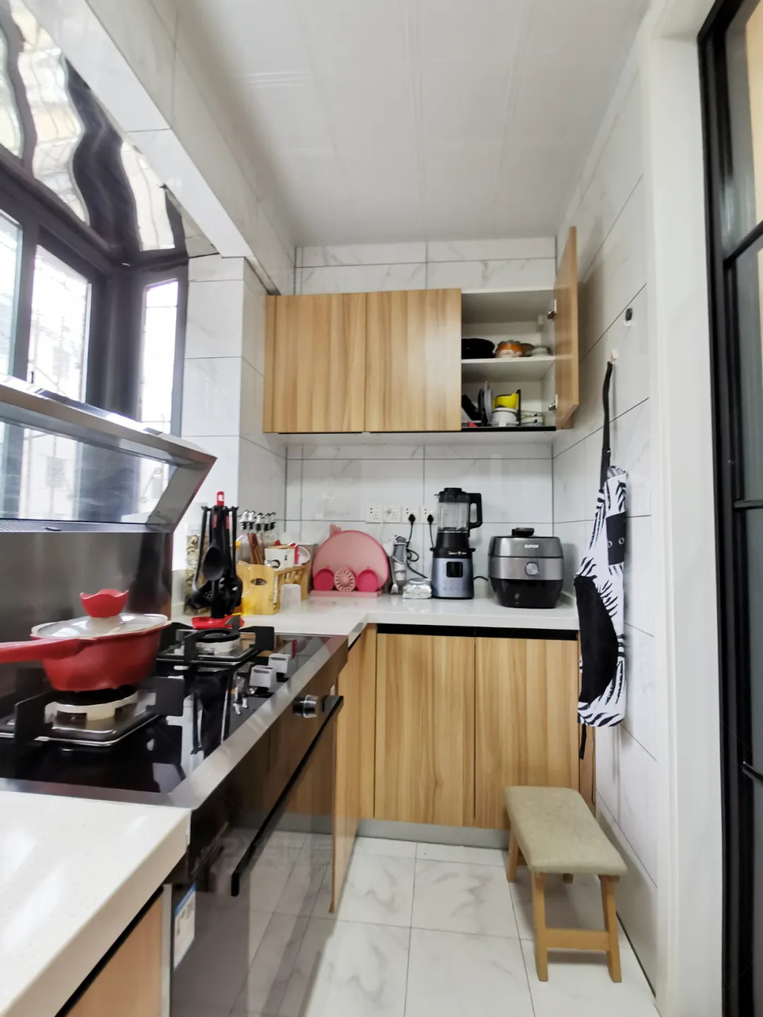 4.原客廳陽(yáng)臺(tái)玻璃改推拉門,做廚房;
