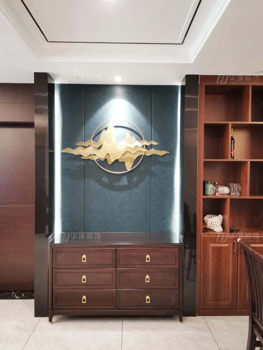從毛坯到入住,每一個細節的推敲,每一次順暢的溝通,都為工程的完美收官奠定了基礎!山色明月照,到來詩景繞。端景裝飾寓意開放包容,山河綿延卻又在方圓之間,將現代中式的詩性與意蘊煥活于空間。