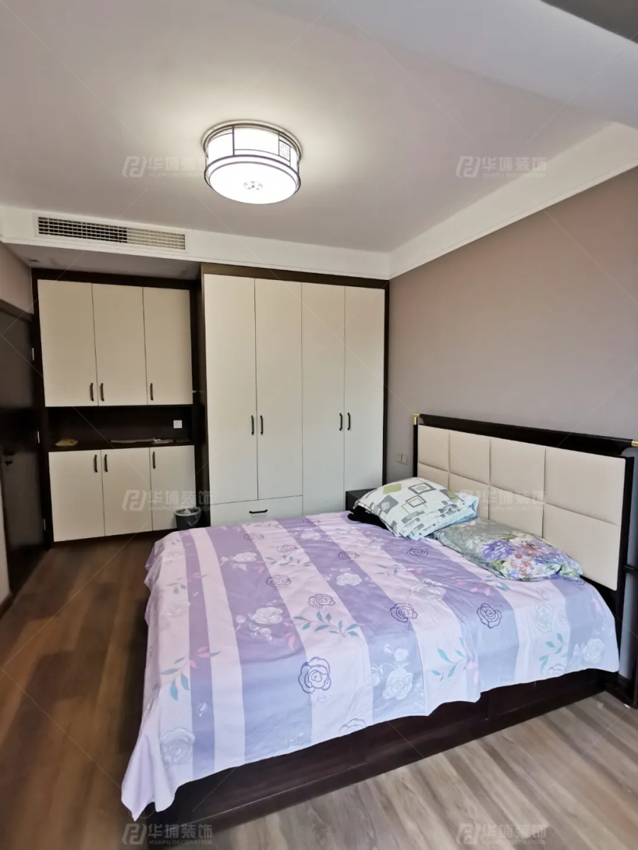 細心觀察,就會發現每一間臥室,入戶處都有組合衣柜,將玄關鞋柜的功能帶入,優化生活。次臥整個空間偏清簡一些,一切陳設落得簡凝妥當。