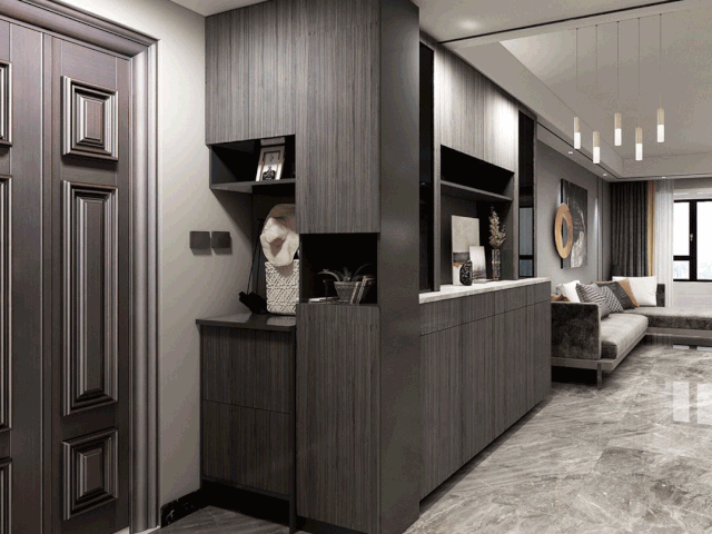 原戶型玄關只有40公分的寬度,略微擁擠,設計師借用了餐廳酒柜的空間來加深鞋柜,完成入戶不同功能需求的分區。