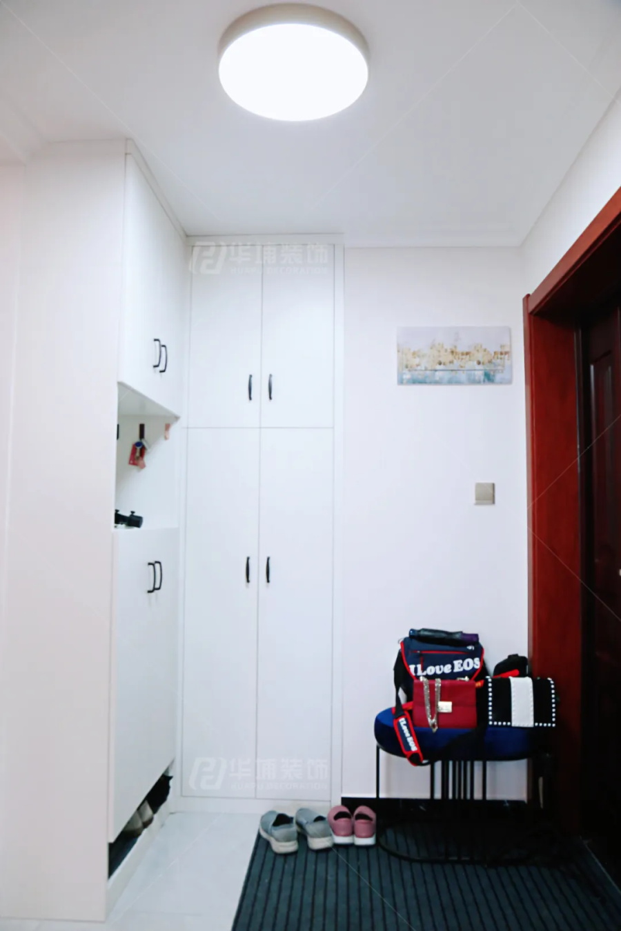 1.入戶廚房門洞敲掉,借用墻體內(nèi)嵌玄關(guān)鞋柜;