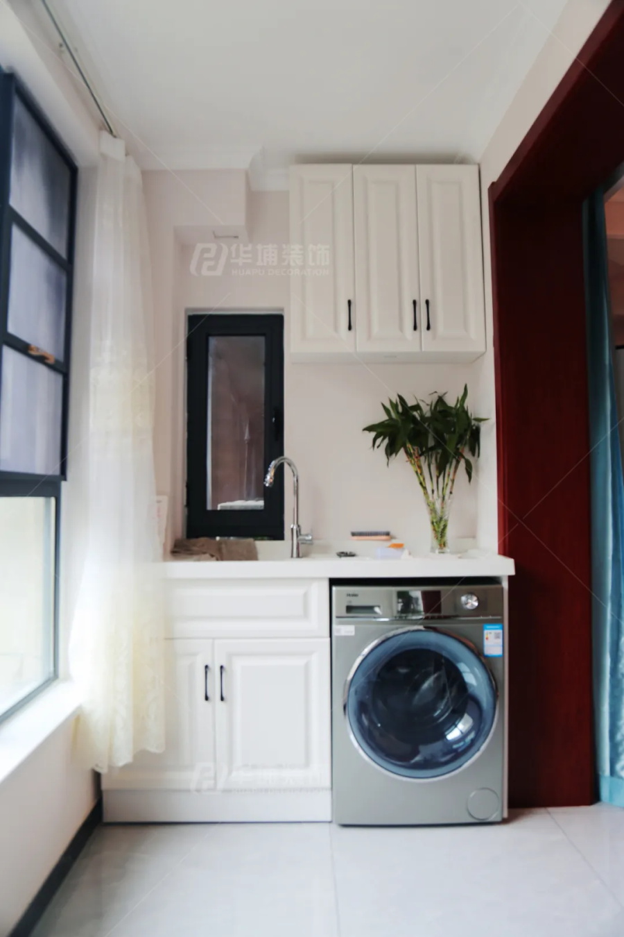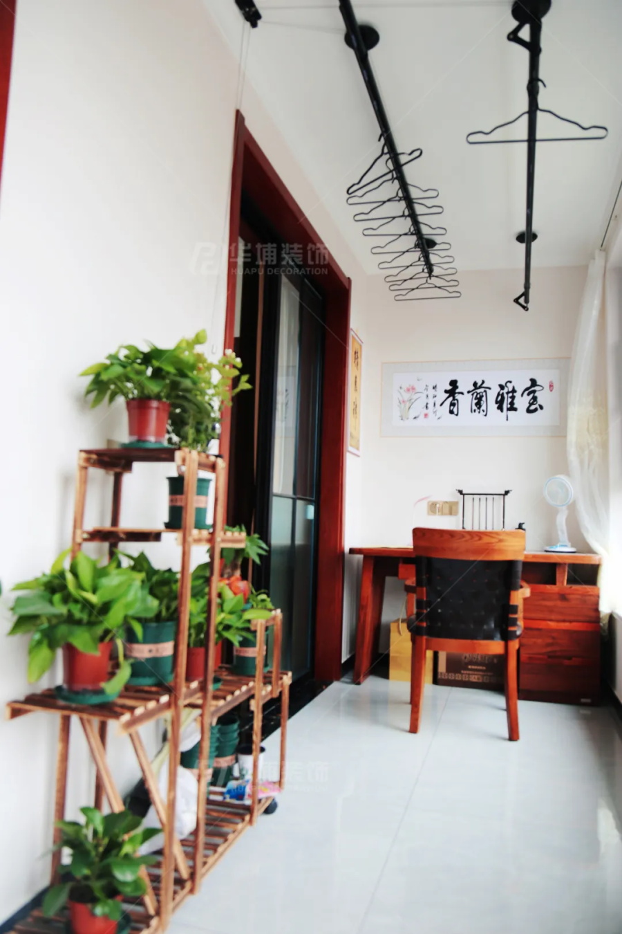 客廳陽臺是一個大通廊,兩頭分區(qū)。一側(cè)做書房,平時張叔叔練練書法,陶冶情操;另一側(cè)是洗衣房,李阿姨打點生活的場所。