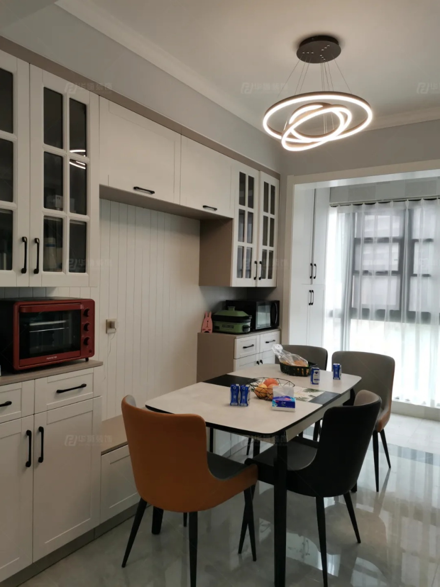 餐廳以功能與實(shí)用為主,四人位餐桌椅+卡座設(shè)計(jì),兩側(cè)的柜子充分收納,不再有空間局限,讓待客成了游刃有余的事情。