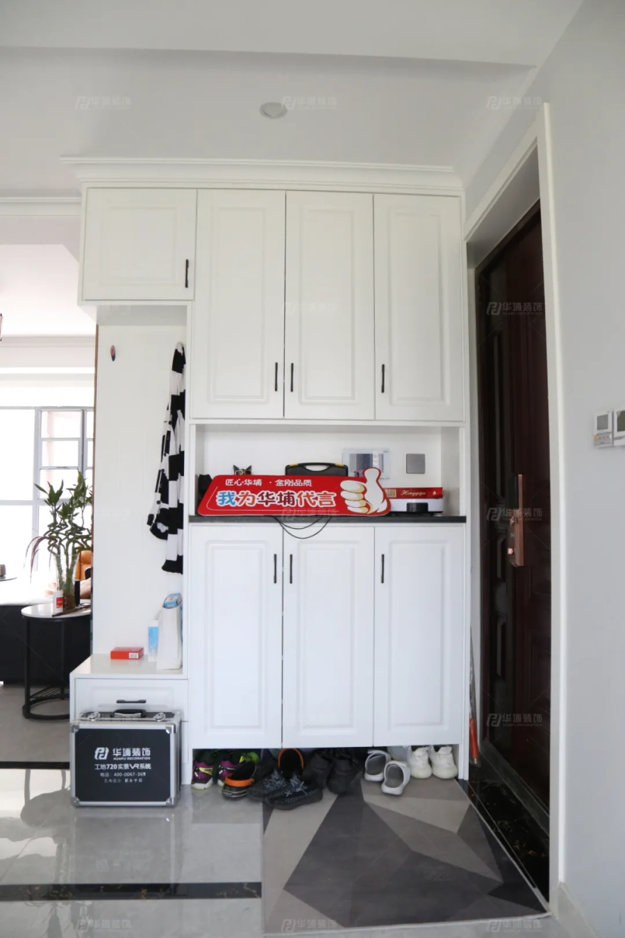 入戶常規設計,頂天立地的玄關柜,中部留空放一些隨手的鑰匙、包包等,底部懸空放置日常的鞋子,同時加入衣帽鉤、換鞋凳的設計,簡化、歸置生活。