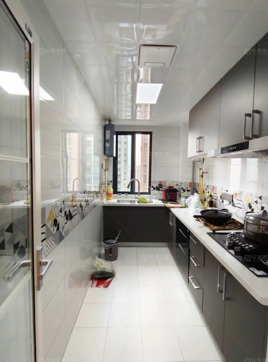 廚房是L型空間,光潔的瓷磚加上花色腰線,流暢的洗切炒動線,各種廚具電器,這才是真正的煙火生活。