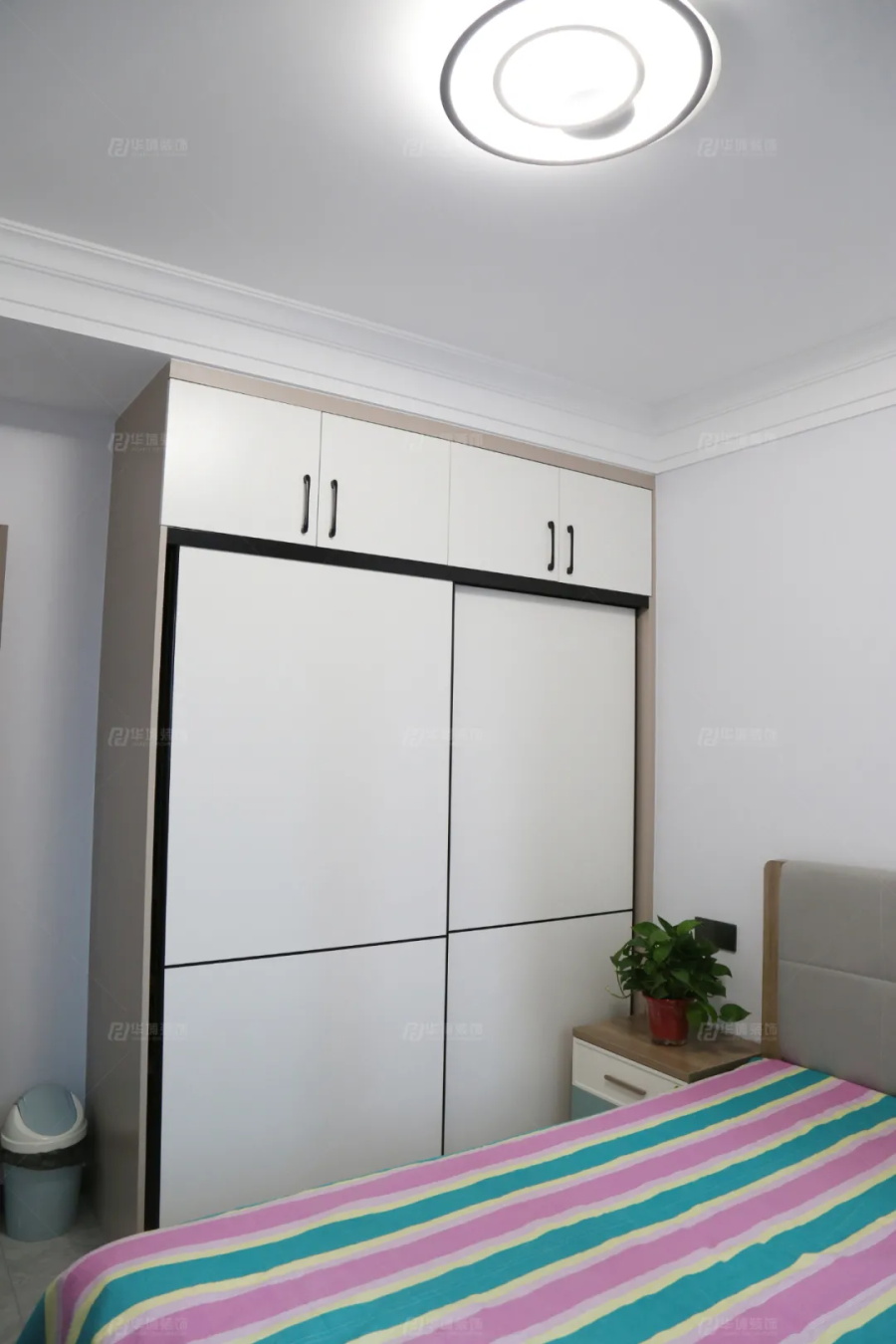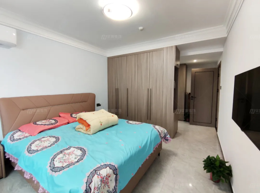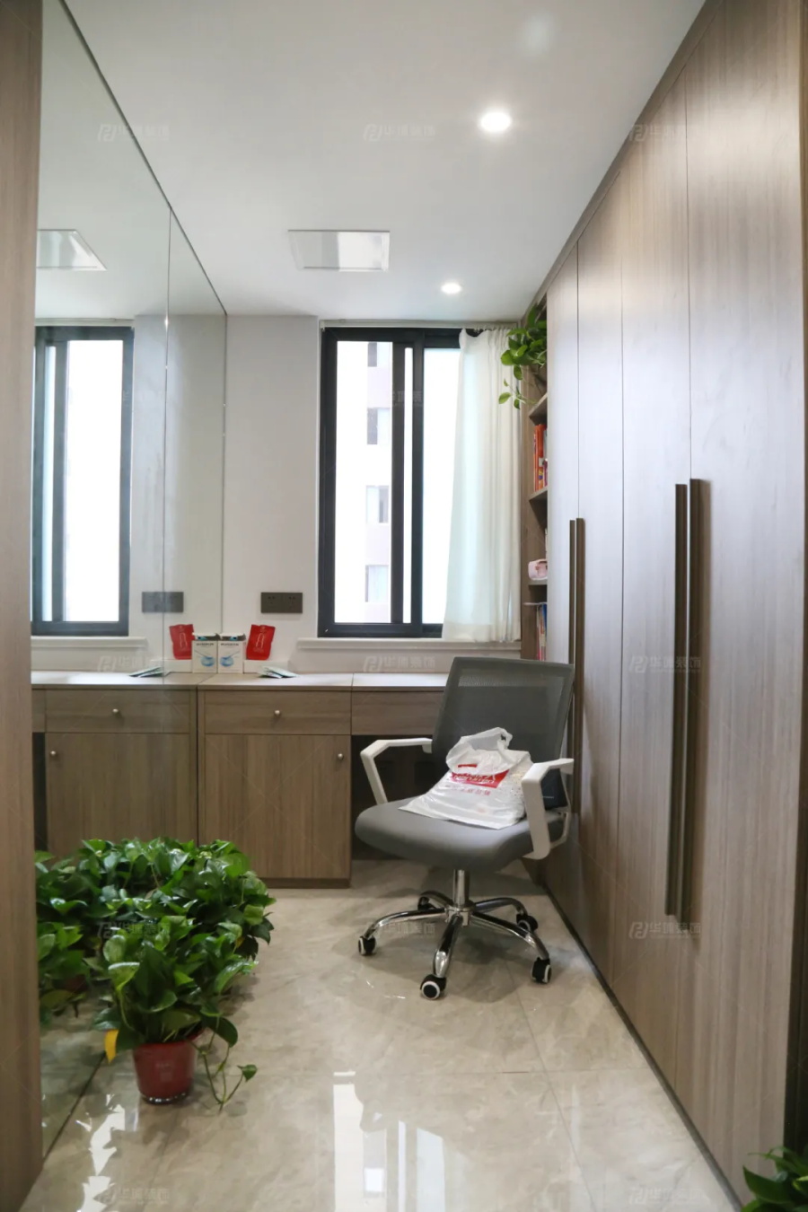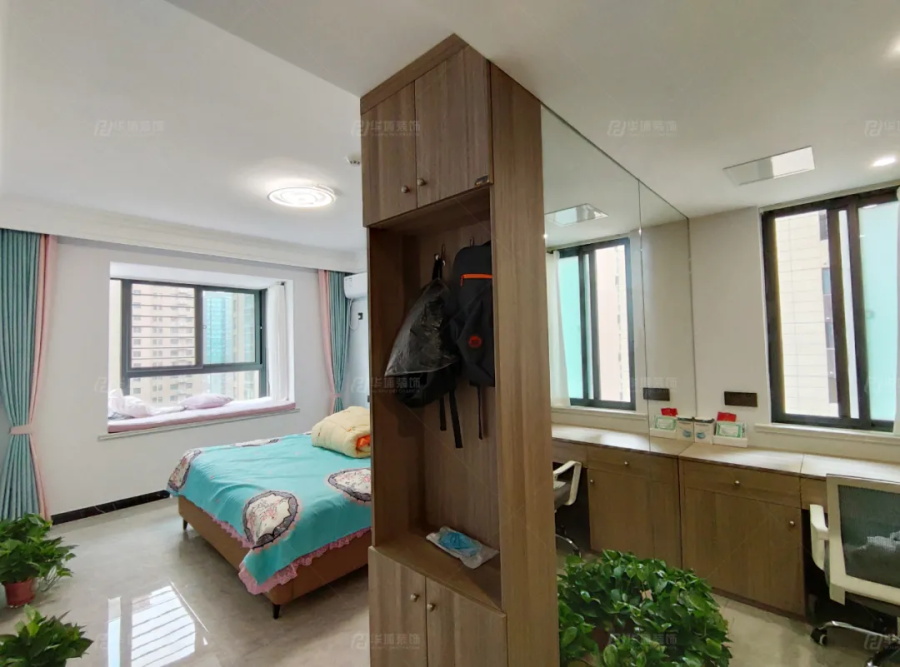 主臥構思巧妙,“雙面孔”衣柜,一側做柜體收納,一側做鏡面隔斷,窄邊還是衣帽鉤和鞋柜,實用滿分。衣柜內側是主臥區,棕色+綠色+粉色區域點綴,小溫馨小浪漫。鏡面一側是辦公區,靠窗做書桌臺,就算晚上加班,也不會打擾到愛人休息。