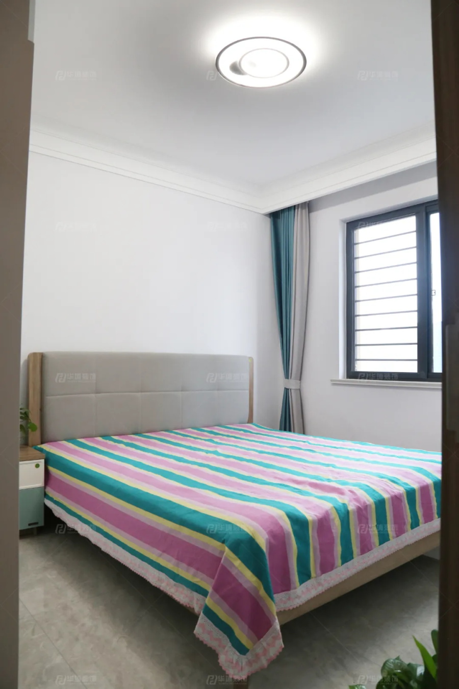 次臥陳設簡素,拼色的格子布床品讓空間多了一絲俏皮,很暖。
