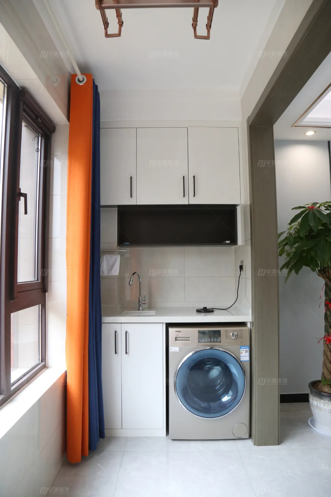 客廳以“即簡即奢”作為設(shè)計理念,整體配色統(tǒng)一,包括乳膠漆、護(hù)墻板、地磚、吊頂,頂?shù)睾弦?,呈現(xiàn)了一個光潔通透的大視角空間。陽臺作為生活區(qū),以吊柜+地柜+洗衣機+洗手臺做陳設(shè),滿滿的實用。