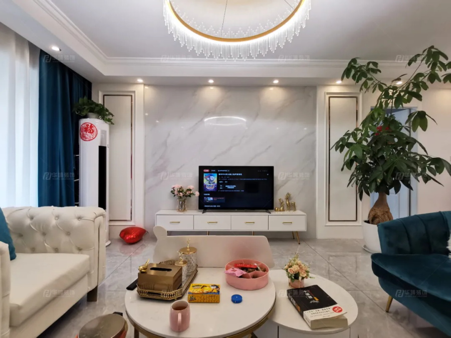 客廳以象牙白為主色調,藍色的抱枕、單人椅、窗簾做點綴,將優(yōu)雅詩意的氛圍營造。電視墻選用石材+護墻板+金屬條突出造型,而沙發(fā)背景卻在護墻板和金屬條的基礎上裝飾掛畫,兩個墻面相呼應,形成了一種對稱美。光感設計在生活中也是非常重要的,吊頂除了主燈外,還走了一圈射燈,這樣就可以在不同的環(huán)境下隨意切換燈光,即使晚上看個電視電影,也不會刺眼。