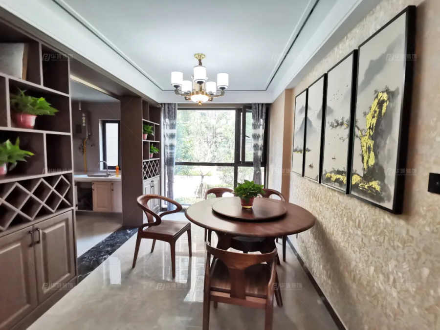 餐廳選用傳統(tǒng)的中式圓桌,是團(tuán)聚和幸福的祈愿。酒柜、餐邊柜以廚房為中心軸,內(nèi)嵌在兩側(cè),可以藏酒,可做收納。背景墻掛了一組中式山川畫(huà),細(xì)品皆是詩(shī)情畫(huà)意。
