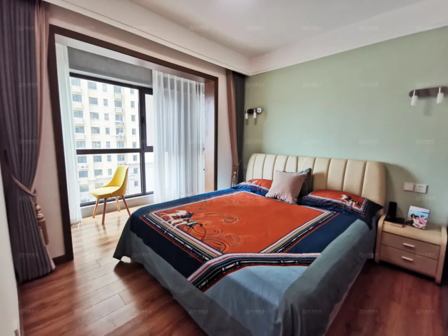 主臥小碰撞,有清新的淡綠色,有高貴的愛馬仕橙,有暖色的木地板,還有可以休閑的陽臺......