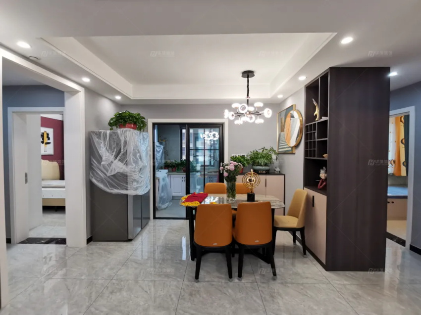 新建墻體后的餐廳,更加連貫、更具視覺感。雙面酒柜的加持,讓平淡的用餐生活,多了一分浪漫和情調(diào)。