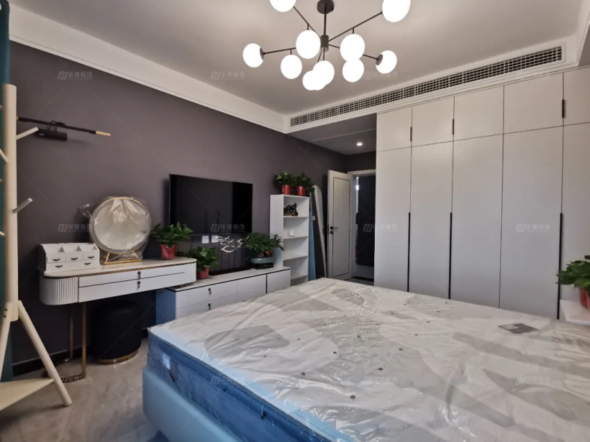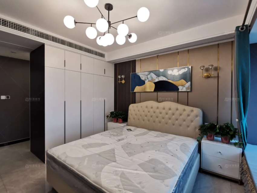 主臥內(nèi)容豐滿,硬包+護(hù)墻板+不銹鋼金屬線條+掛畫,多元素組合的背景墻,沒有絲毫的突兀,反倒是更加立體。衣柜是做了雙面柜體設(shè)計(jì),外側(cè)做小衣帽間,內(nèi)側(cè)整理日常,實(shí)用滿分。