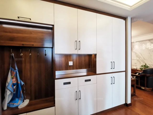 玄關映入眼簾的是一個組合柜,有非常強大的儲藏功能。柜體陳設是根據入戶換鞋、掛衣、放鑰匙包包的行為動線排列的,同時還加入了大容量儲存過季衣物的分柜,妥妥的一個衣帽間呈現。