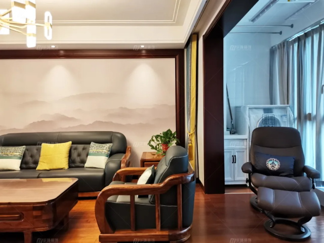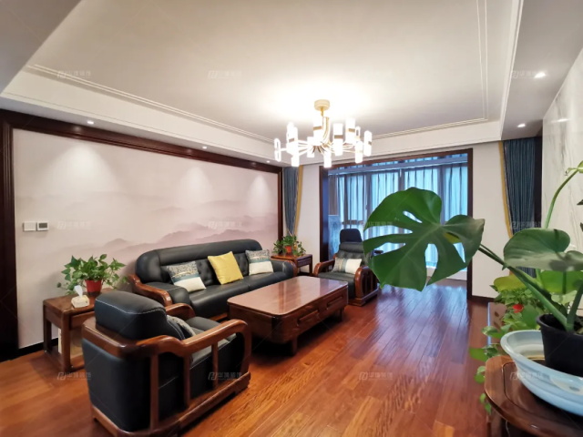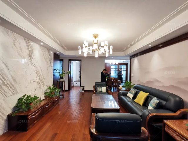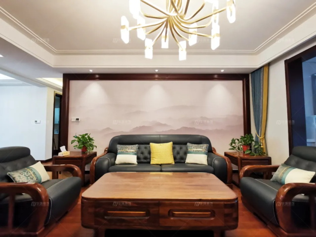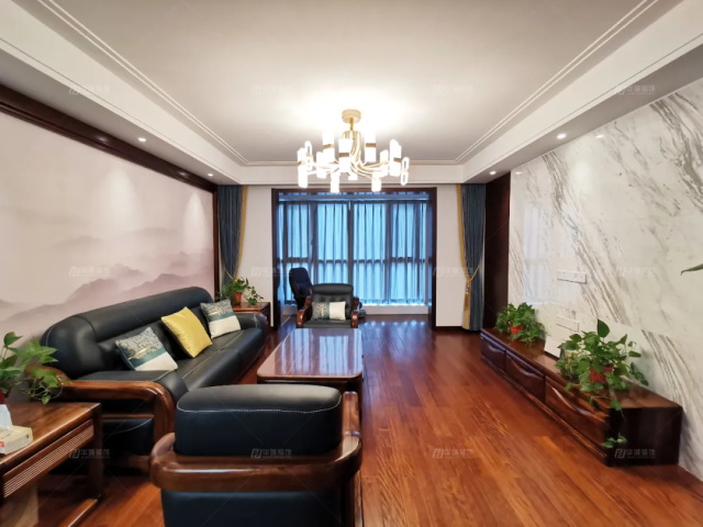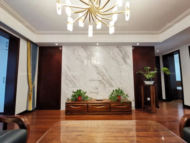 客廳做了一個色彩的對比,通鋪的實木地板奠定了暖、古色的基調,沙發背景是層巒疊起的山川,電視墻水墨樣花紋大理石,山水有相逢,來日皆可期!