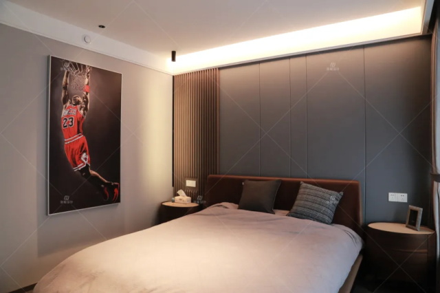 主臥:木質格柵+硬包背景、自由旋轉式吊線燈