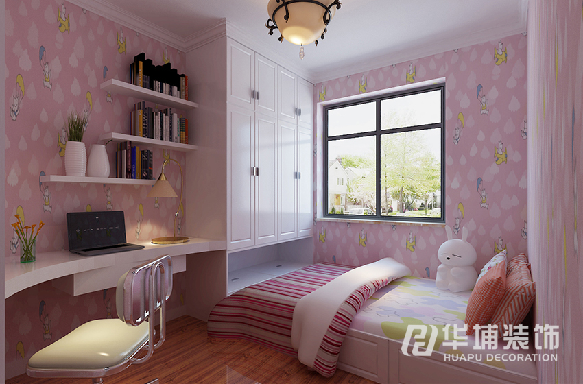 兒童房——整體貼粉色壁紙,衣柜與床為一體,合理的利用空間。