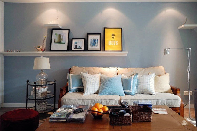 書柜收納作電視背景墻,淡藍色的色彩搭配,更顯清新