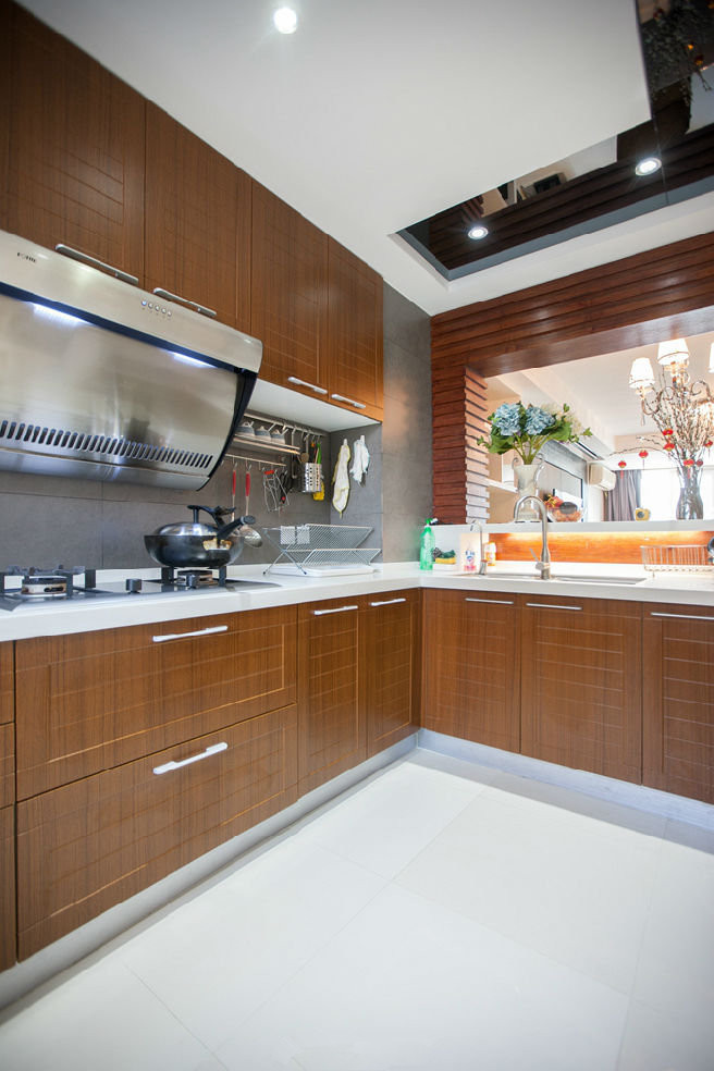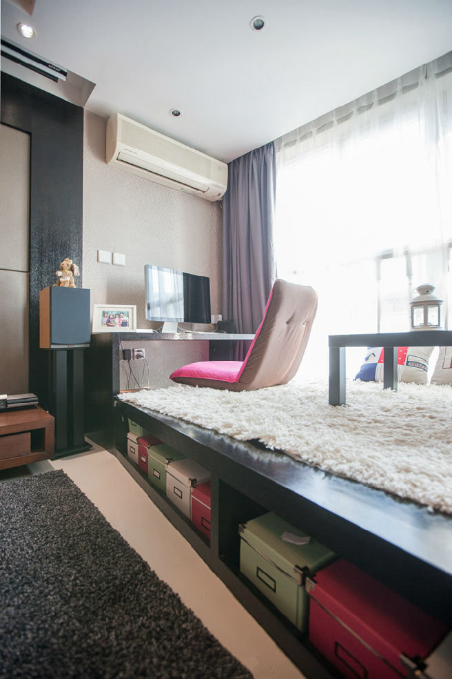 【三口之家 現(xiàn)代簡(jiǎn)約三居室】客廳的榻榻米工作區(qū)很棒呢。伊頓上郡裝修設(shè)計(jì)效果。