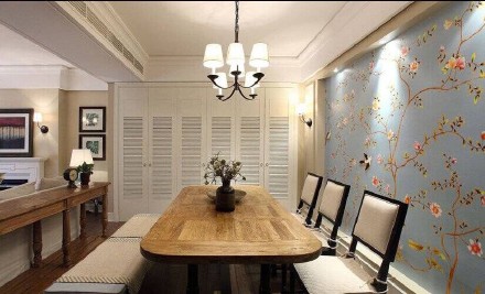 餐廳,餐桌,原木餐桌,漂亮的吊燈,碎花壁紙特別的好看