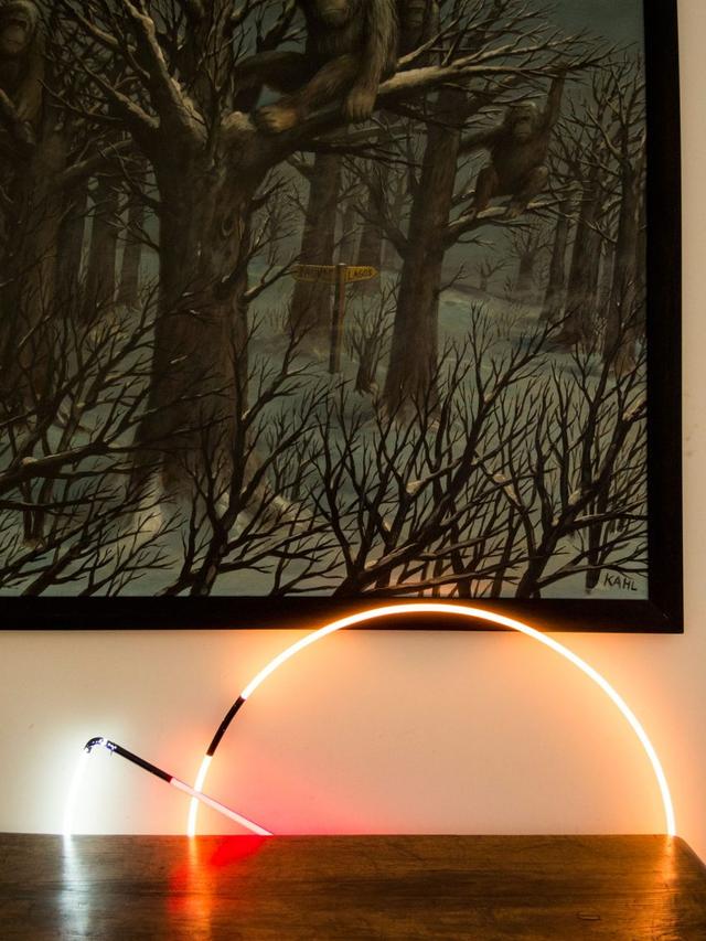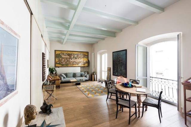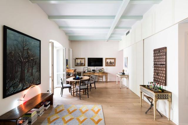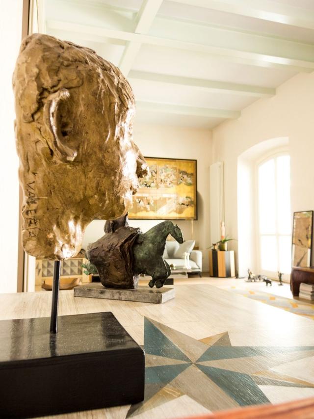 客廳的擺設裝飾也是別致。歷史感十足的雕塑,藝術氣息濃厚的掛畫,造型奇特的環狀燈飾,現代與復古的碰撞。
