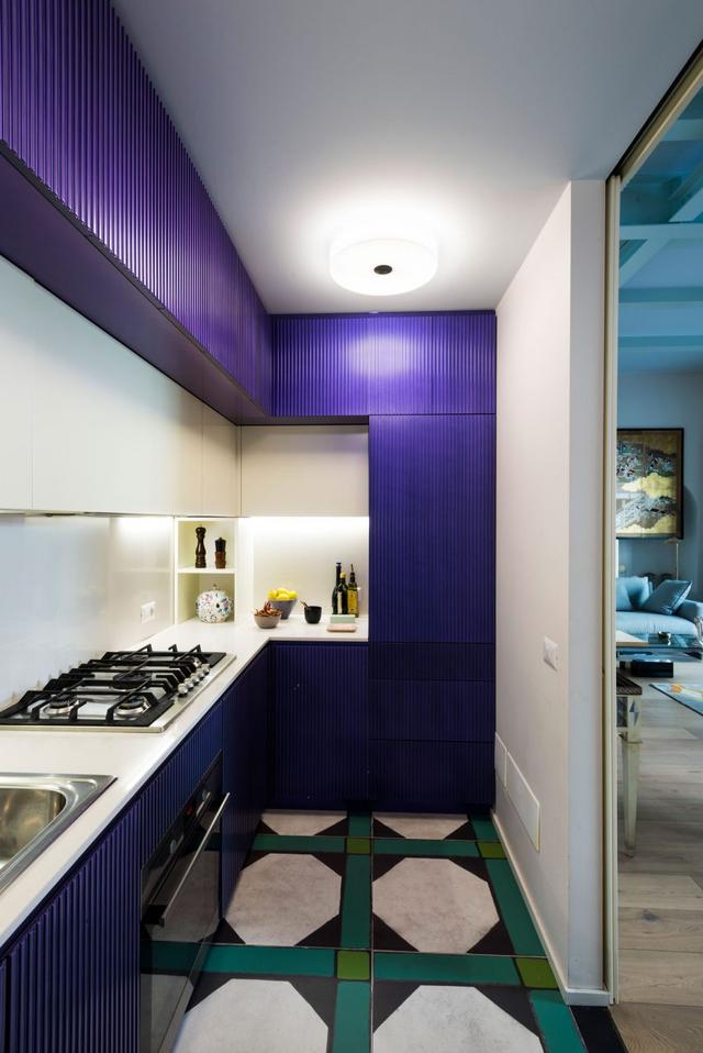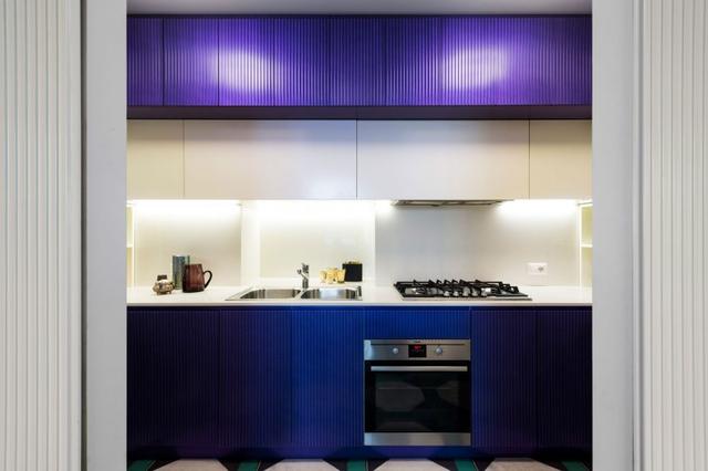 廚房用色大膽到讓人驚嘆。整體櫥柜大面積使用了飽和度很高的寶藍色,加上花紋拼色的地磚,讓人的眼睛應接不暇。