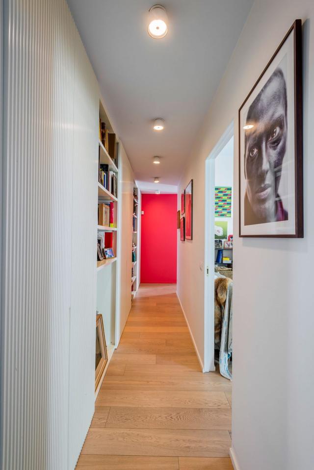 走廊整體被設計成了書架。琳瑯滿目的書籍加上墻上的掛畫,頗具文學藝術氛圍。走廊一側盡頭的紅色墻體,也是讓人眼前一亮。