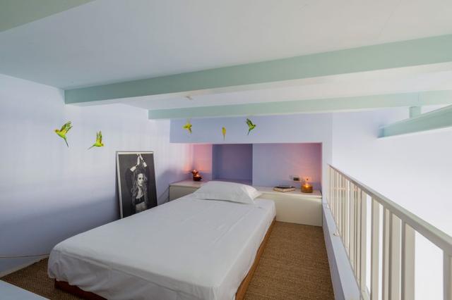 簡約而又時尚的白色色調。床頭的兩個燭臺發出微光,靜謐優雅。黑白色的人像照片隨意擺放著,墻面上手繪的展翅飛翔小鳥為整個空間帶來了生氣。