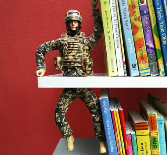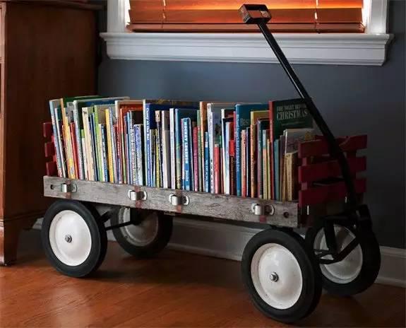 4、大型的玩具車或者玩具船,都可以用來儲存書,看上去整整齊齊,一點都不亂!大一點的橡膠模型玩具,可以切成上下兩部分,黏在書架上作為書立!比買的還好看呢,對不對?