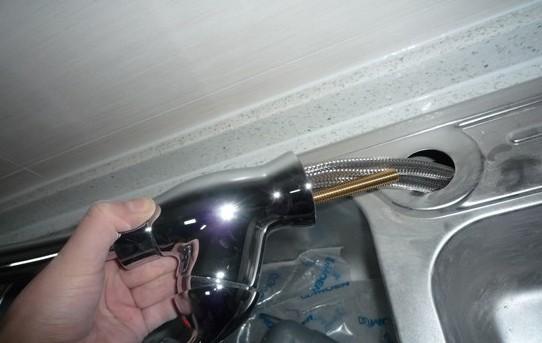 第二步先別急著裝放水槽,應該要先把水龍頭和進水管先裝好,進水管得接上進水開關。要裝冷熱水管的,這一塊不要搞反了。
