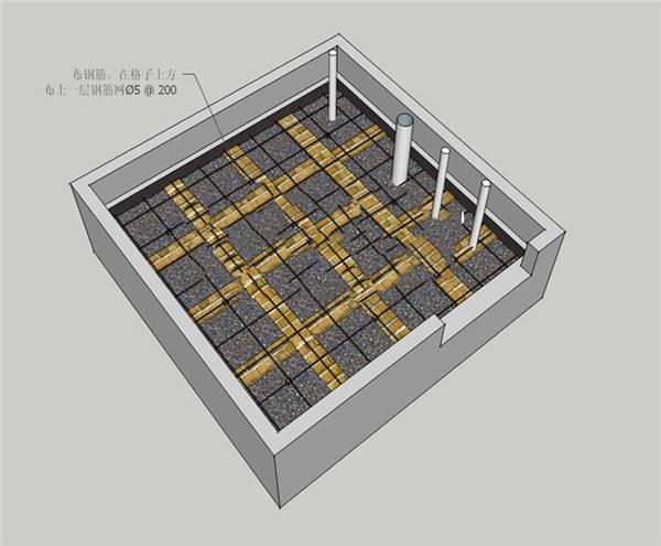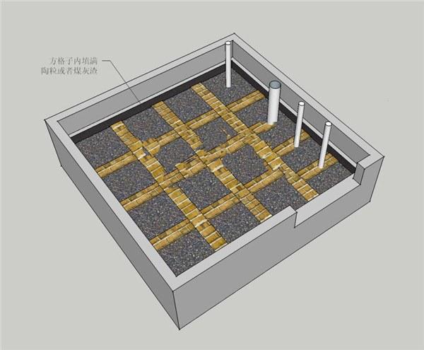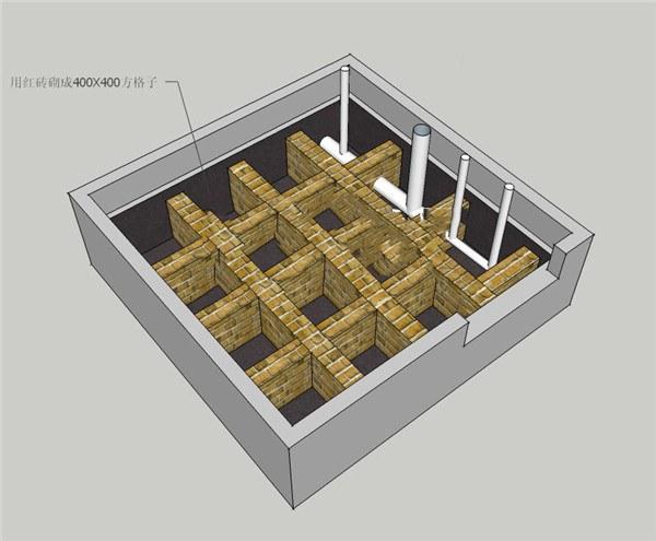 2、做完防水之后就要用紅磚給沉箱做隔斷架空,400*400的格子,這個(gè)步驟最好都做,因?yàn)樘畛淞颂樟V笊厦婢鸵茕摻睢⒆鰸仓隽诉@個(gè)格子就能防止上面的混凝土層往下墜了,不然幾年之后肯定會(huì)下沉、開裂、漏水。