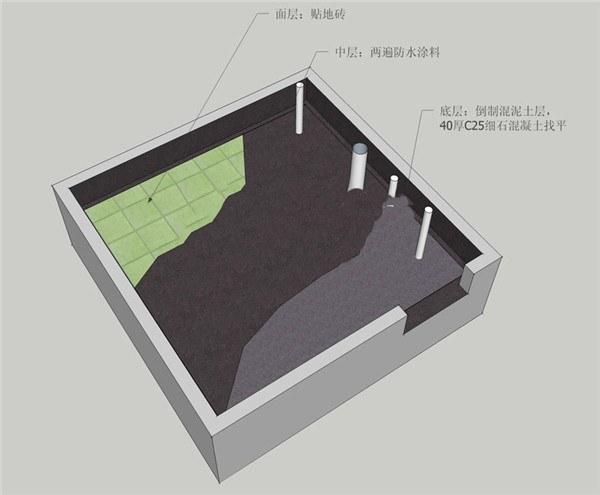 5、最后倒入混凝土,要做個(gè)瀉水坡,等干了之后再做兩邊防水,這一次防水就要連著衛(wèi)生間墻都做了,最好做到1.8m高。接下來就正常鋪磚就行了。