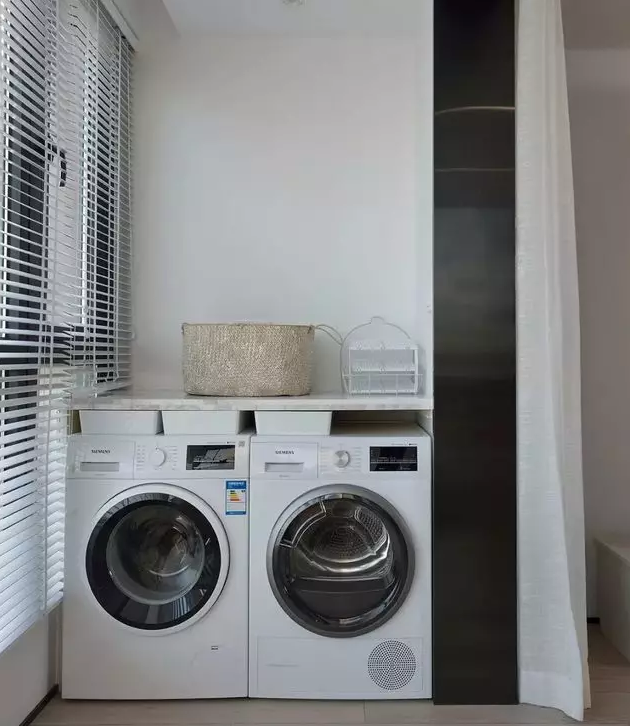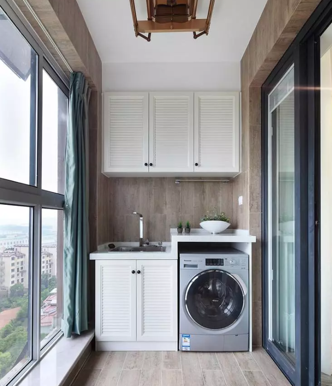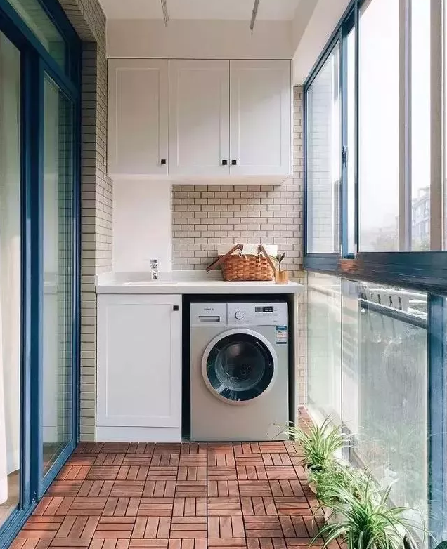 2.陽臺最好選擇滾筒洗衣機(jī),這樣方便嵌入到洗衣柜里邊。并且洗衣機(jī)的高度要在85cm左右,洗衣機(jī)臺要在90cm以上,盡可能預(yù)留出一部分的空間。