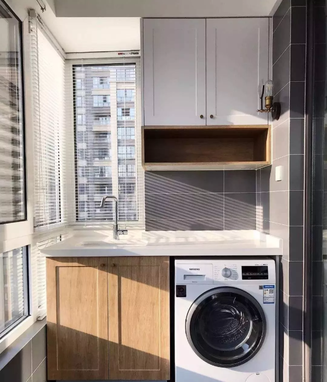 6.一般陽臺日曬都比較嚴(yán)重,這時(shí)候要做好防曬工作,保證洗衣機(jī)使用壽命,洗衣柜盡量不要做木質(zhì)的,最好選擇磚砌一個(gè),更耐用;還可以在陽臺上裝上窗簾,避免陽光直曬。