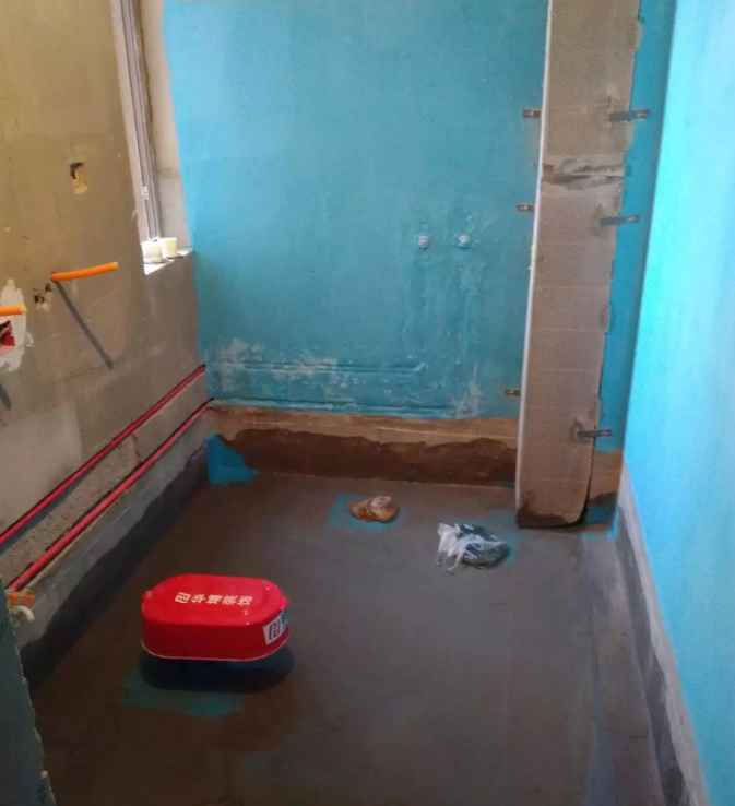 (注:華埔裝飾工地衛生間要求做統一的防水施工工藝,墻面涂刷公司標準藍色防水,地面使用丙綸防水材料施工。)